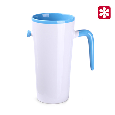 Origineller und auffälliger Becher in fünf Farbvarianten des Innenraums und des Henkels. Die große Druckfläche bietet eine breite Palette von Möglichkeiten für die Markenwerbung. Dieses Produkt ist ein Auslaufmodell und kann Nadelstiche, Punkte sowie Unterschiede im Farbton der Glasur aufweisen.