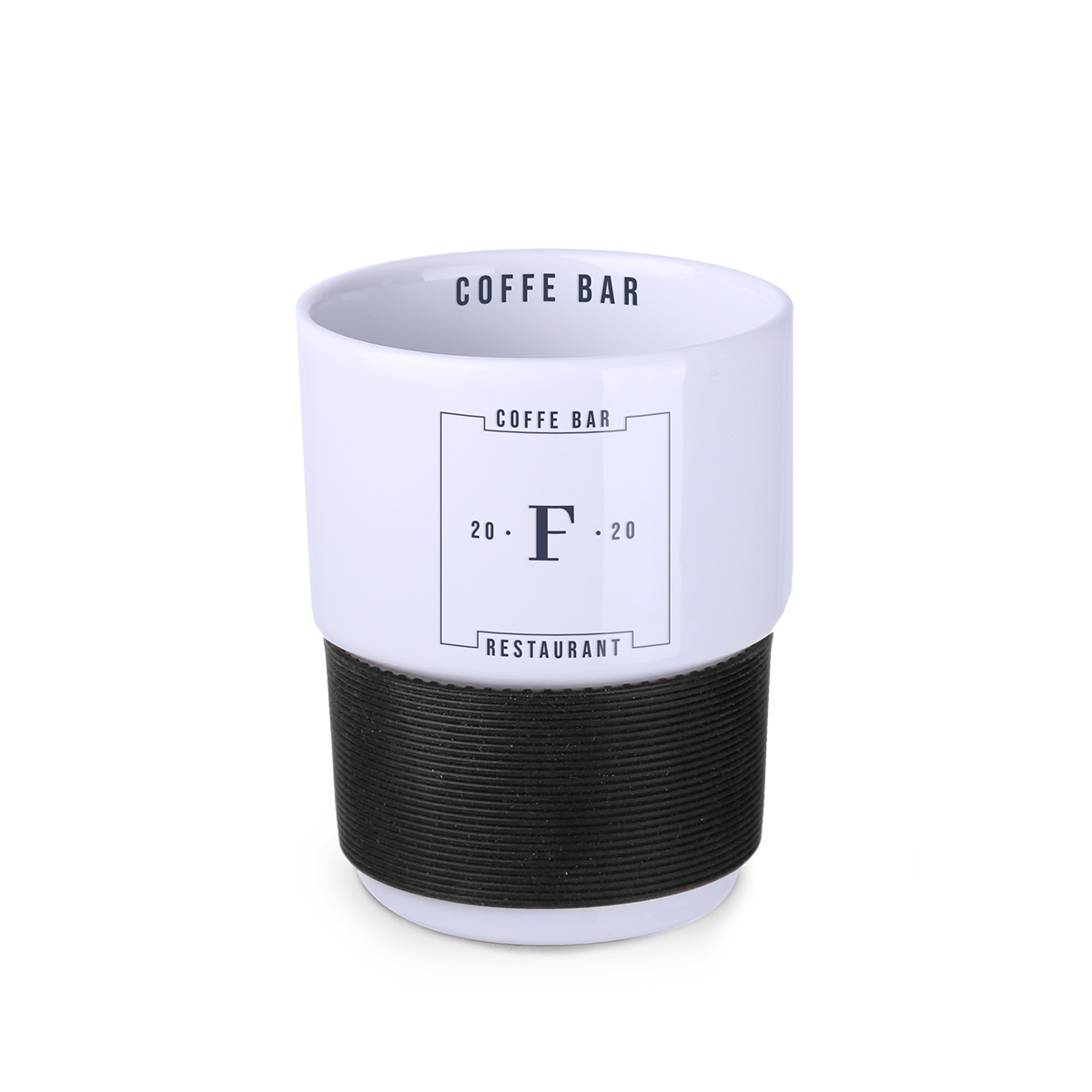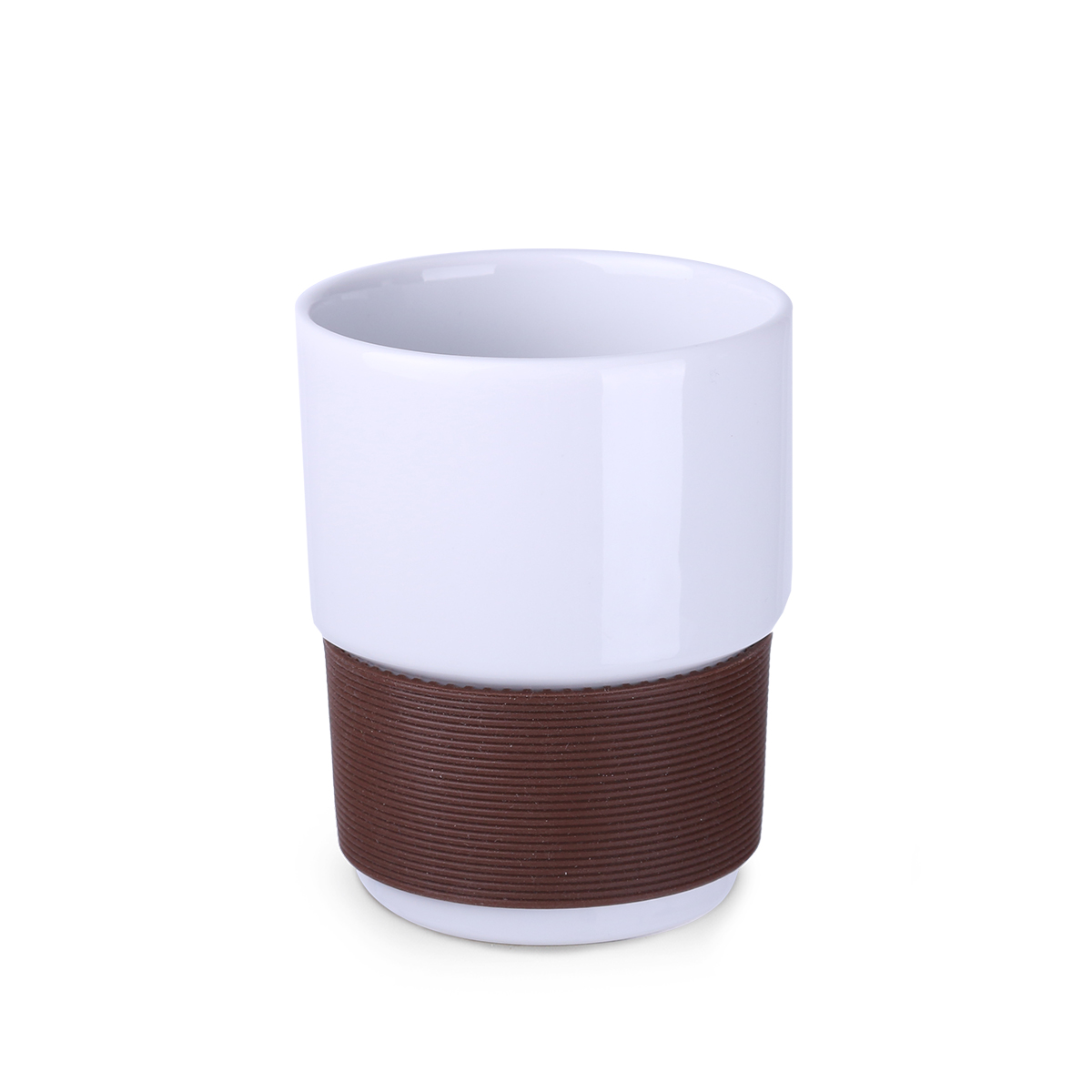 Mittelgroßer Werbebecher aus Keramik ohne Henkel. 40 mm breite Bänder, erhältlich in 7 Farben: weiß, orange, rot, grün, marineblau, braun und schwarz.