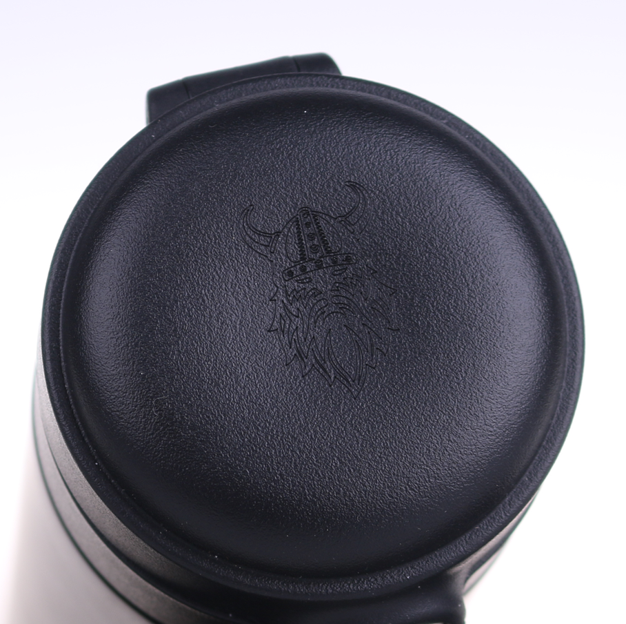 Vega Lasergravur auf schwarzem Metallbecher |
