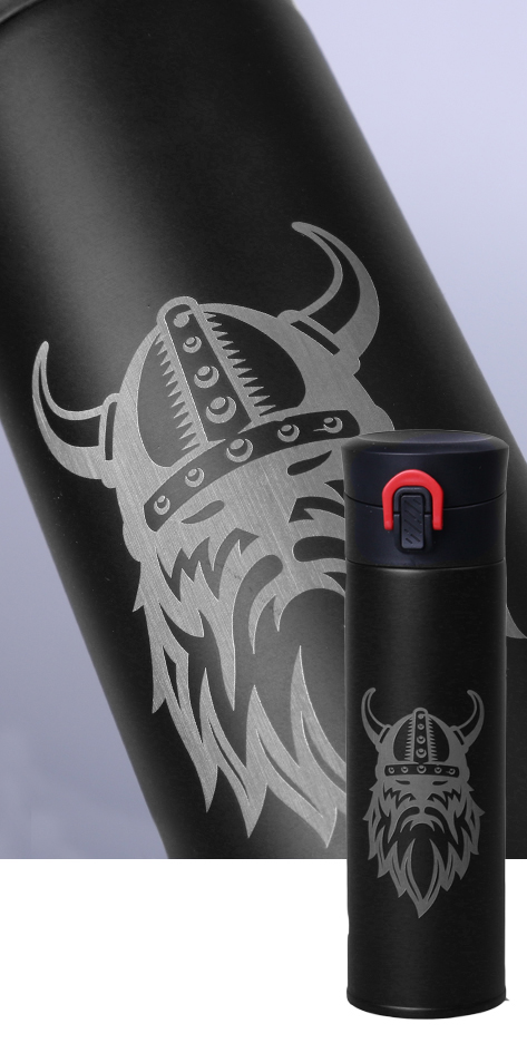 Die Lasergravur wird auf den Metallkörpern von Galaxy-Thermobechern und -flaschen, auf Glasprodukten und auf Keramikbechern mit farbiger Glasur durchgeführt.